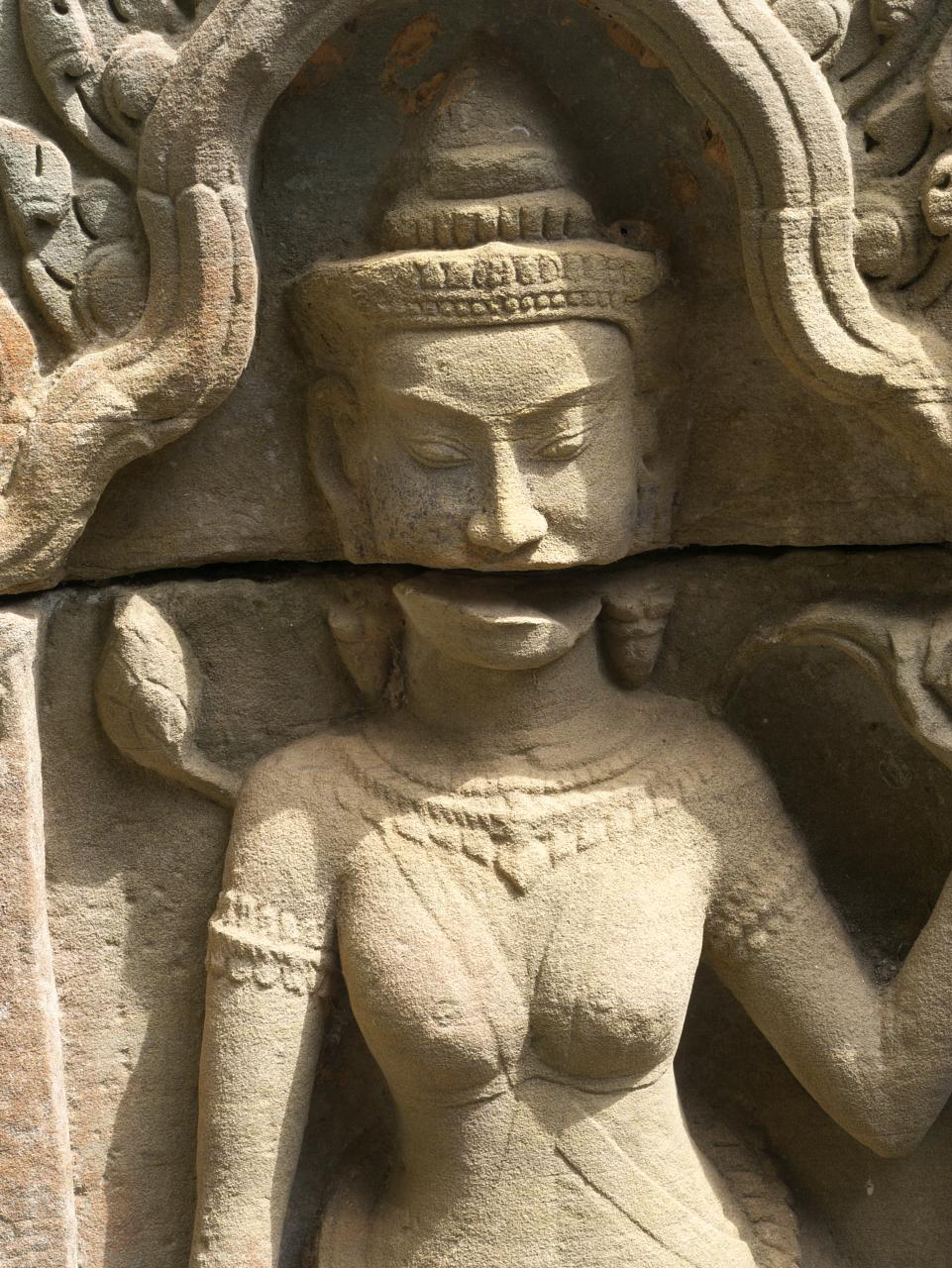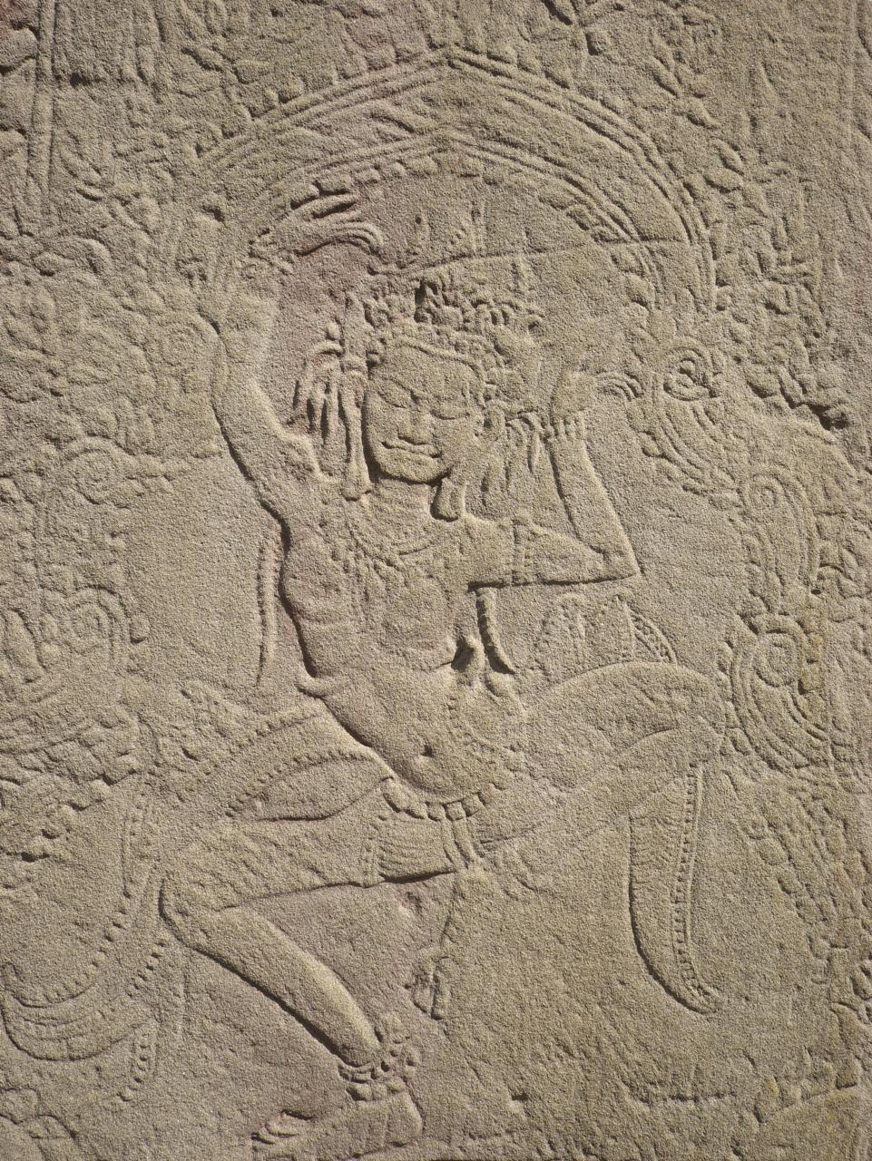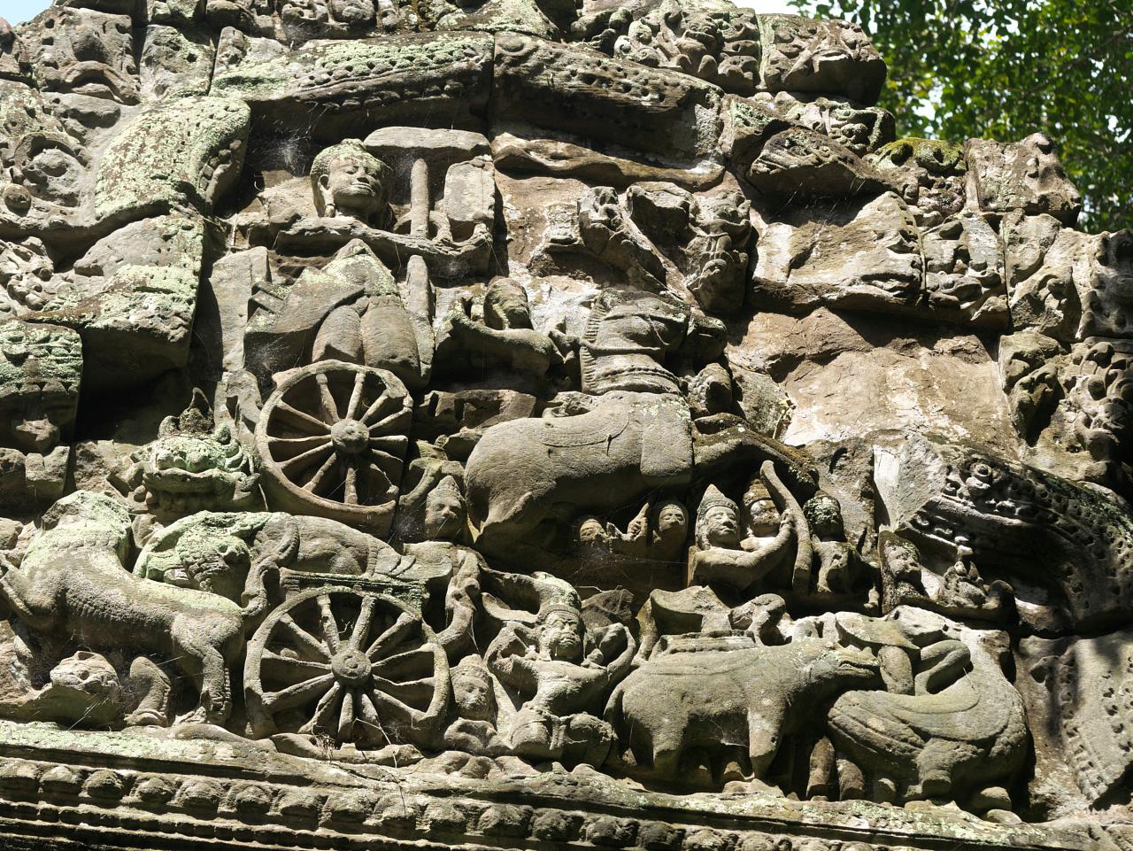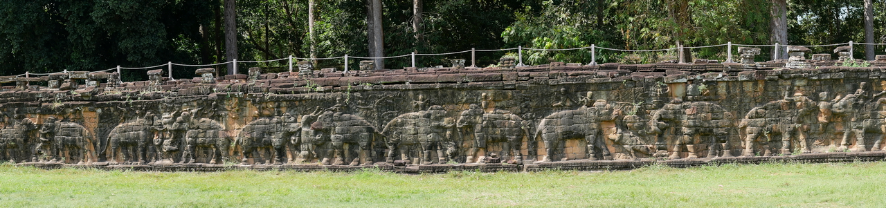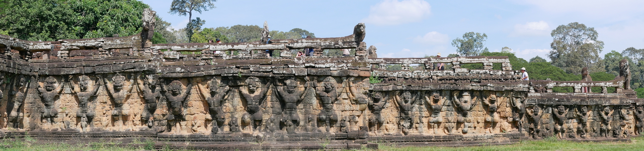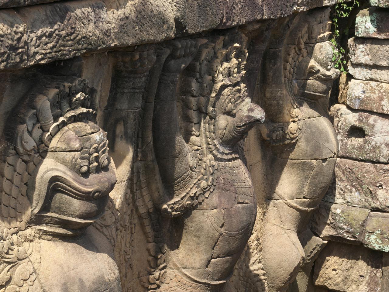 Day 2 started with a visit to Elephant Terrace, also part of Angkor Thom. We were eager to see it and were not disappointed. The terrace wall is 2.5 metres high and 300 metres long, adorned with carved elephants and mythical flying guardians called garudas. Its platform was used to review victorious armies. From there we entered the temple complex for more exploration.