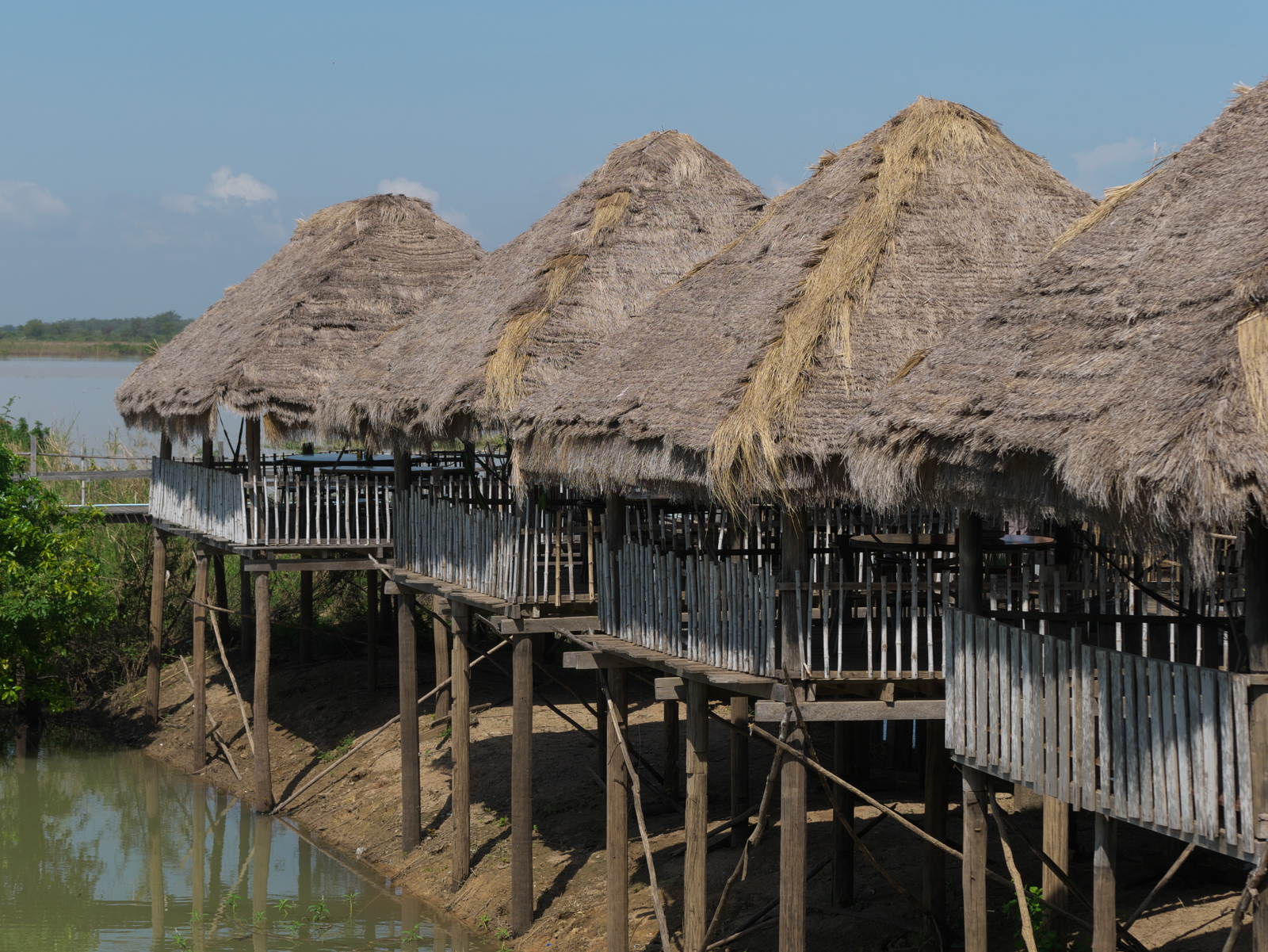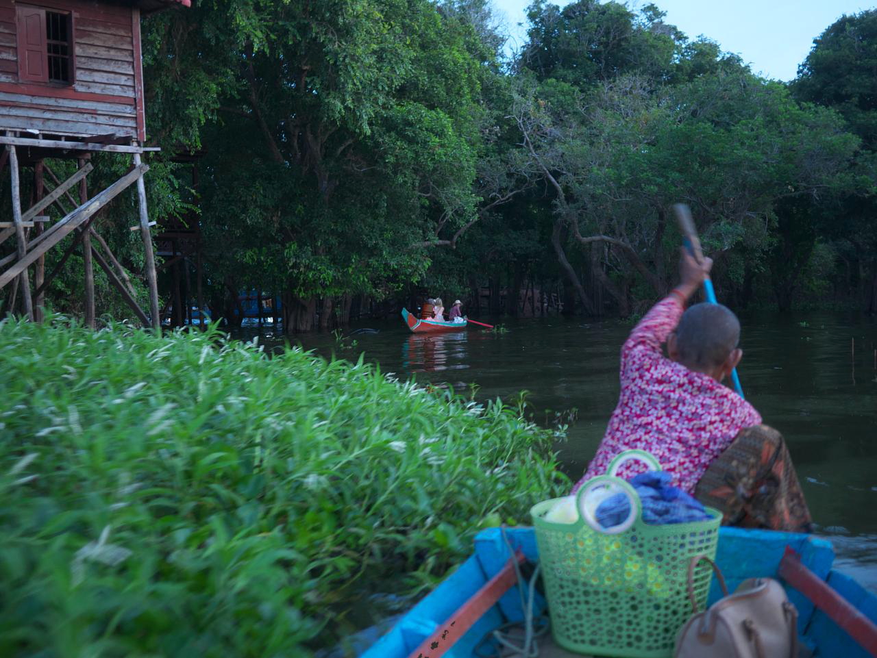 The day was still young. Our driver suggested a visit to a floating village so off we went for a 55km tuk-tuk ride somewhere in rural Cambodia. Gasoline, we discovered when we stopped for a fill, is sold in recycled bottles at roadside stands and costs about the same as in Canada. We had no idea where we were going or why we were going there and were financially unprepared — a visit to the money changers was on our list — but managed to come up with the US$22 each for the entry tickets. It was well worth it. Our tuk-tuk dropped us off and we clambered down a muddy bank to start down a long river in a bright orange boat captained by a young lad of about 12. He eventually pulled over and we transferred into small boats paddled by elderly women for a tour of their village and its houses high up on stilts.