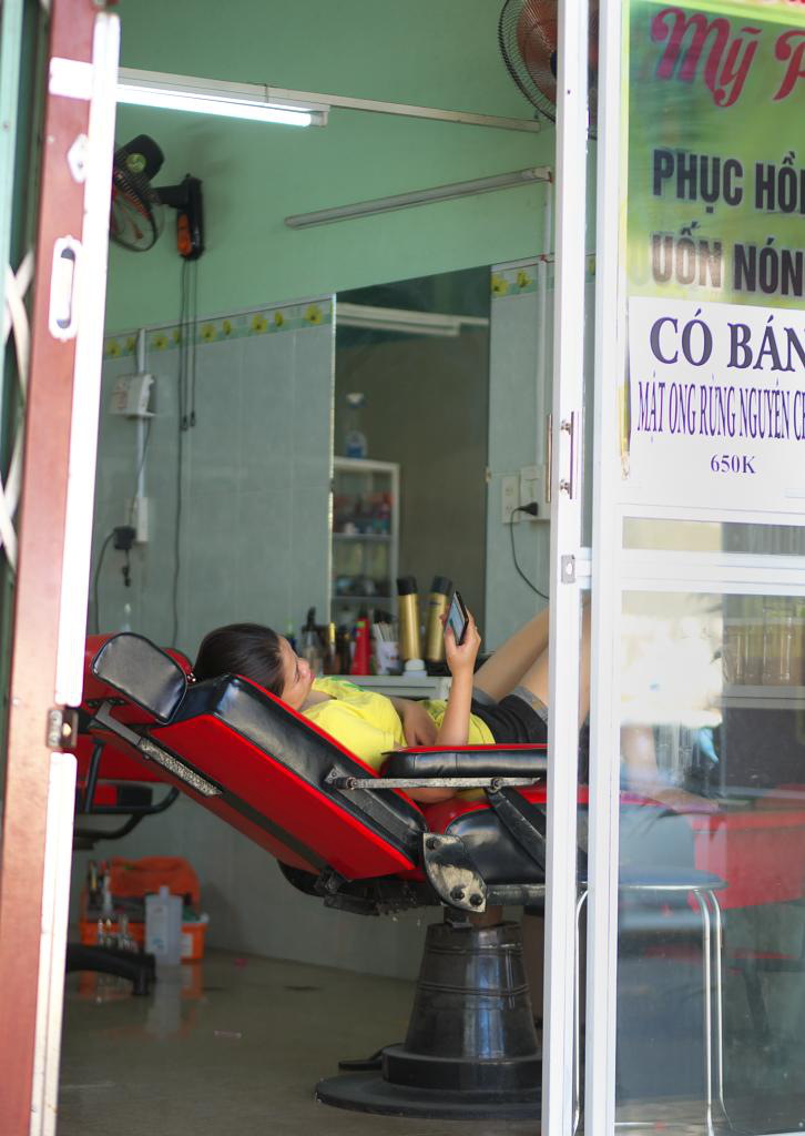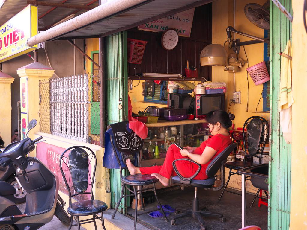 A little more walking down streets lined with small shops — lots of barbers, ear cleaners and hairdressers — to a restaurant we’d passed earlier. We dutifully wrote down what seemed to be the restaurant name — Kinh Chao Quykhach — but can’t track it down and when we translate it the phrase comes back as a generic “welcome.” Hmmm. A fancy restaurant with wood tables pops up using that name but ours had stainless steel tables and red plastic chairs. That’s the best I can do. It also had great local food and a very hospitable owner. A good time.