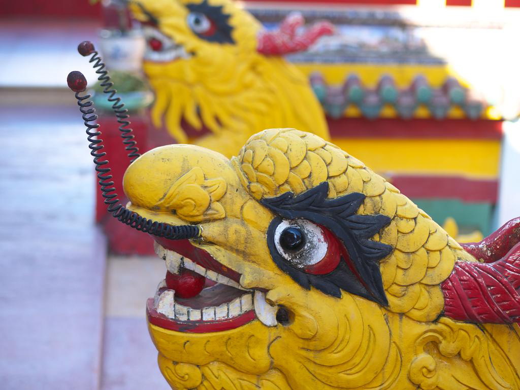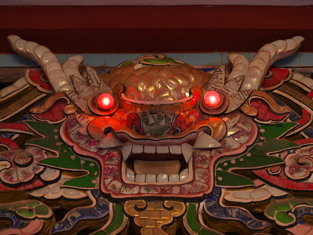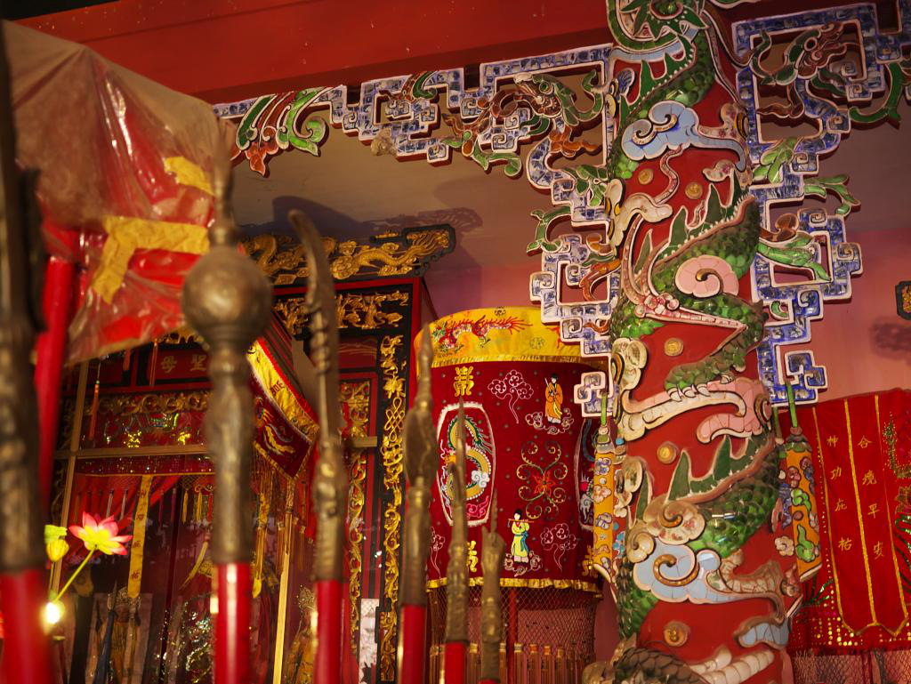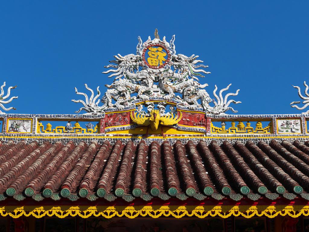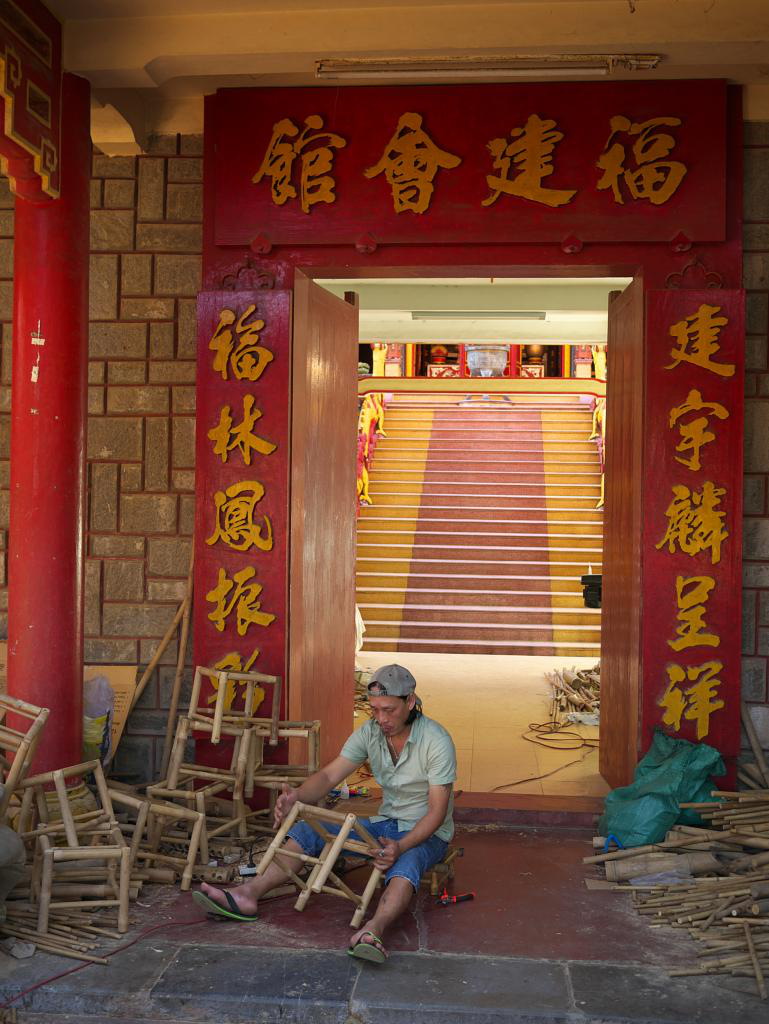 Whatever they’re called, after a bit of walking we finally found them and they’ve seen better days. The buildings and decorations are still there but the ground floor of the Hokkienese & Buddhist Chieu Ung Pagoda (aka, I think, Hoi Quan Quang Trieu) is now used as a bamboo chair factory and paper bundling operation. The paper bundling was a bit odd: a young woman counted through large bales of coloured paper and tied them into reams. Not clear what the paper was for. One imagines these things being done by machine but no. All by hand. She was diligent and very fast at this repetitive and (presumably) boring task.