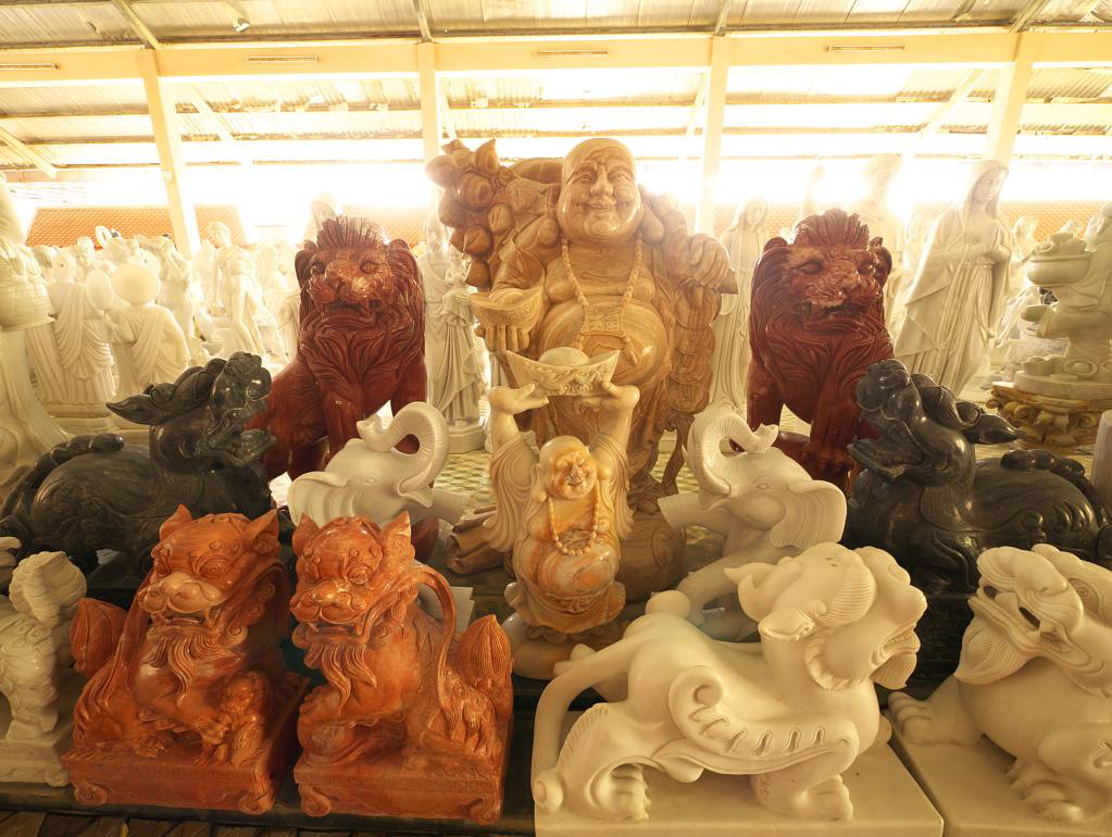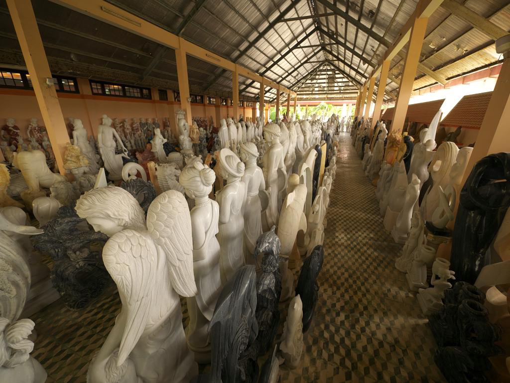 From there we headed down past Da Nang with remnants of wartime bunkers lining its famous airport’s runways. We stopped at Marble Mountains (US$ 2.50 admission) which was an active quarry until quite recently. There are five Marble Mountains but only one is open. We took the elevator up Water Mountain which is riddled with caves, grottoes and shrines. From there we headed for the immense Danang Sculpture Foundation. If you ever want a large Greek-god-style statue of yourself, this is the place. They ship worldwide. Last stop was at VietPearl, a big-box scale jewelry store at the Lo Bac Resort. We were weak and splurged on a couple of pearl necklaces.