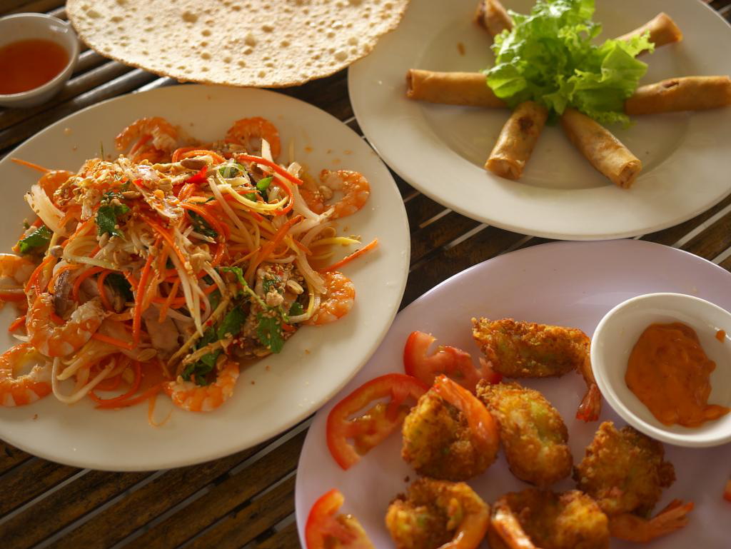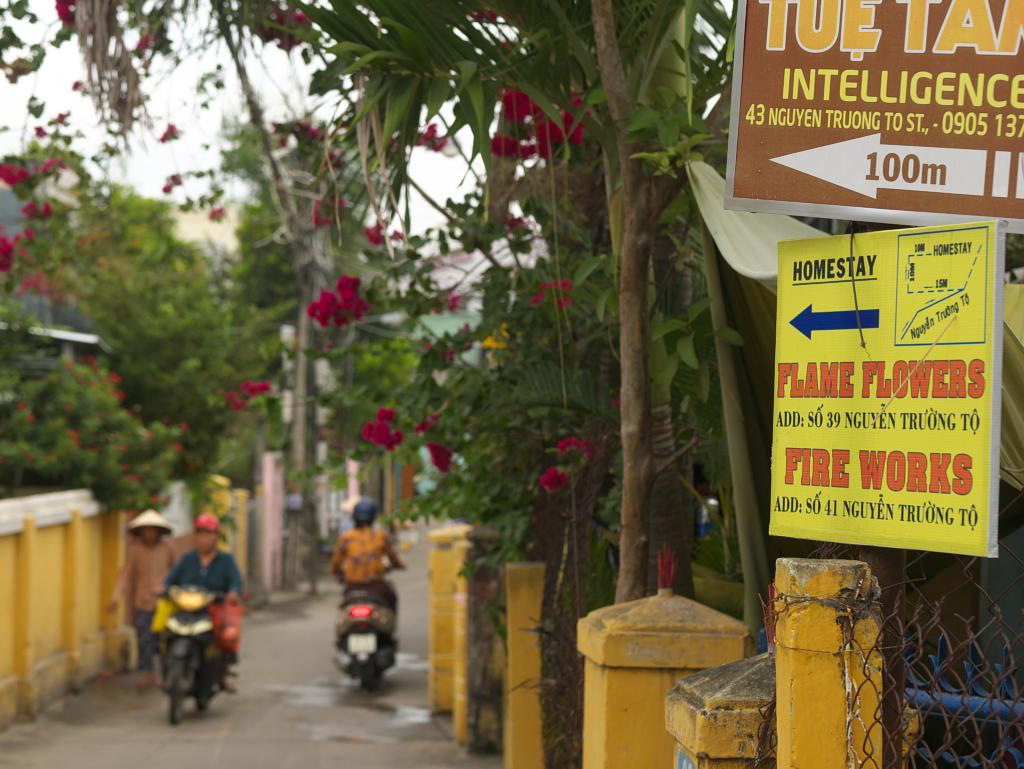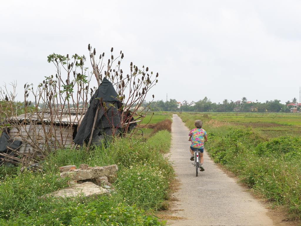 The bus dropped us at Flame Flowers, our Hoi An homestay. Homestays are common in Vietnam and are the result of a government program that allows people to develop their homes as small hotels. Flame Flowers has four floors and a very hospitable host family. They provided breakfast and free bicycles which we used for a trip to An Bang Beach and around town. They were very helpful in arranging tours and recommending restaurants. Homestays are a good arrangement and we enjoyed meeting all our hosts.