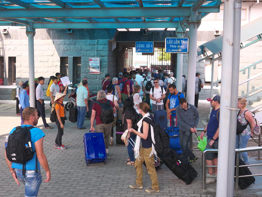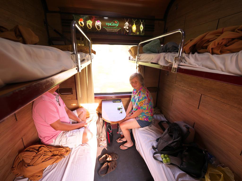 It was back to shore for an enormous lunch, another scooter ride back to Flame Flowers and one more visit to the night market. Our next destination was Da Nang to catch an overnight train to Ninh Binh, southwest of Hanoi. We booked a tour bus that would stop for a cable car ride up to the Ba Na Hills with its huge medieval French village and Golden Bridge, up in the clouds above Da Nang. This was an expensive excursion (C$100 each) and not at all worth it as the entire day was spent in heavy fog and mist with the bridge barely visible. It was capped off with a buffet lunch after which we got lost in the fog of the “village.” We eventually found our group, took the cable car down to the bus and were deposited at the small Da Nang train station for the overnight sleeper car journey north.