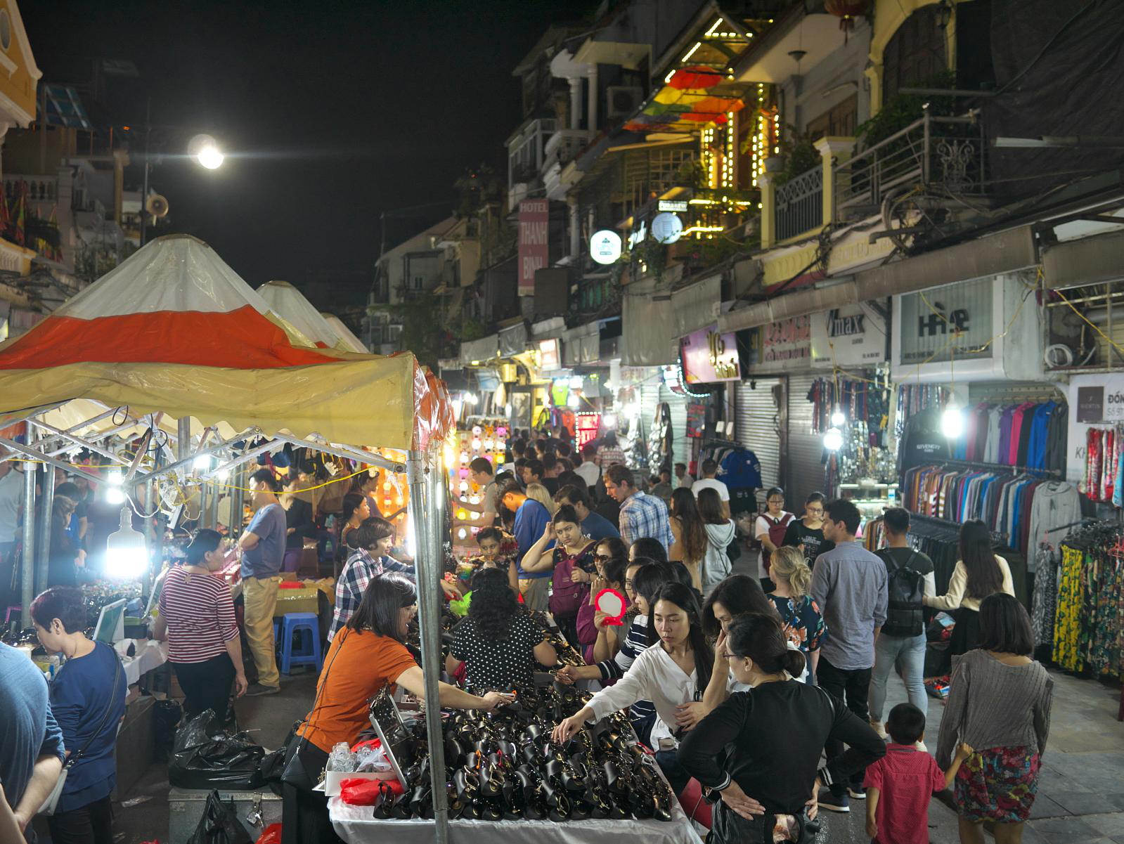 Our first task was to meet up with Alex, cousin of our Ninh Binh homestay host, who booked our Halong Bay cruise. He came to the hotel and gave us lots of advice on what to do in Hanoi including the weekend-only Hanoi Night Market, about a ten minute walk away. Lucky for us it was a Friday night. To book tours in Hanoi you can contact Alex at ninhbinhgreenlandhomestay@gmail.com. Nice young guy and quite reliable.