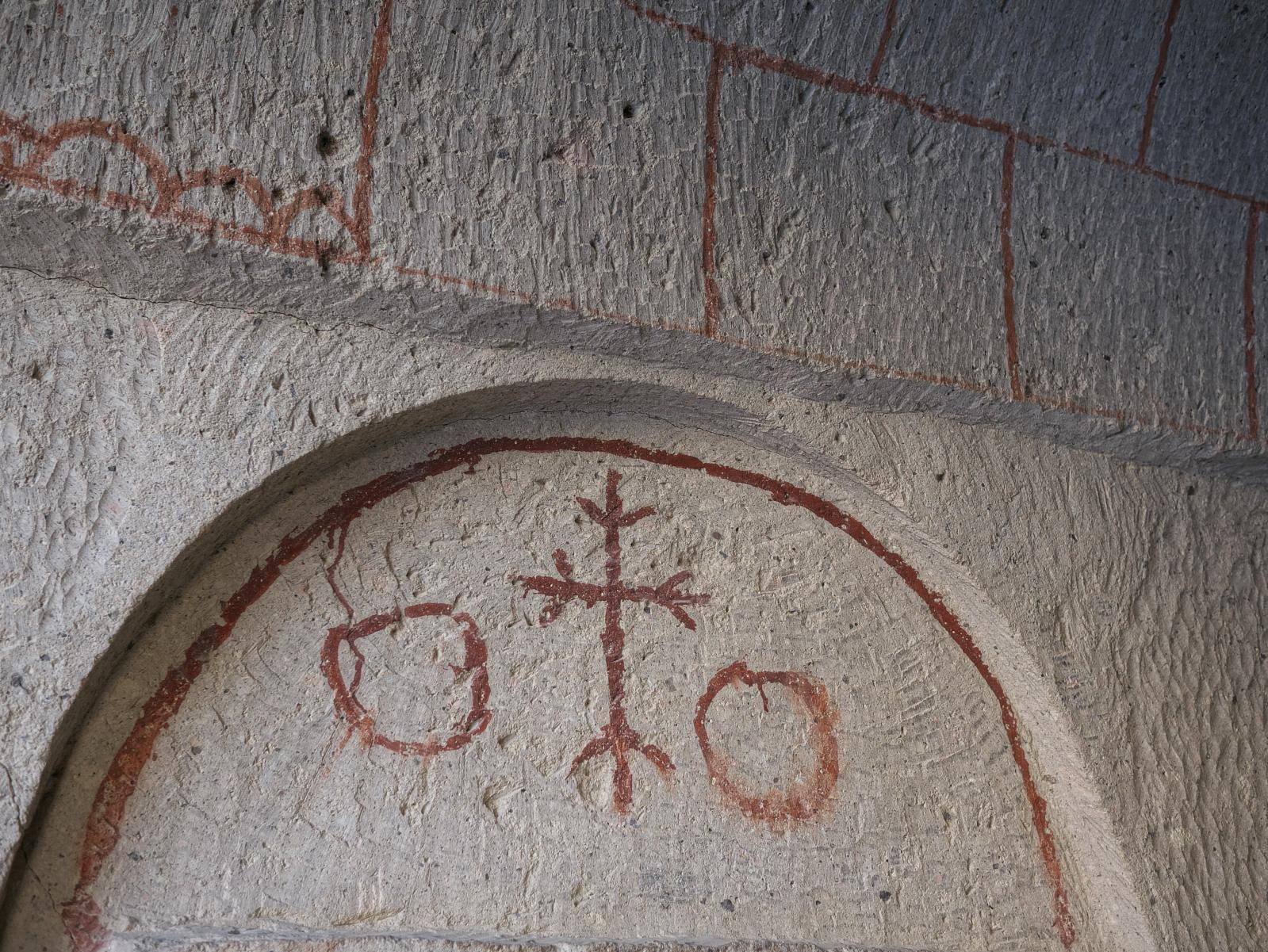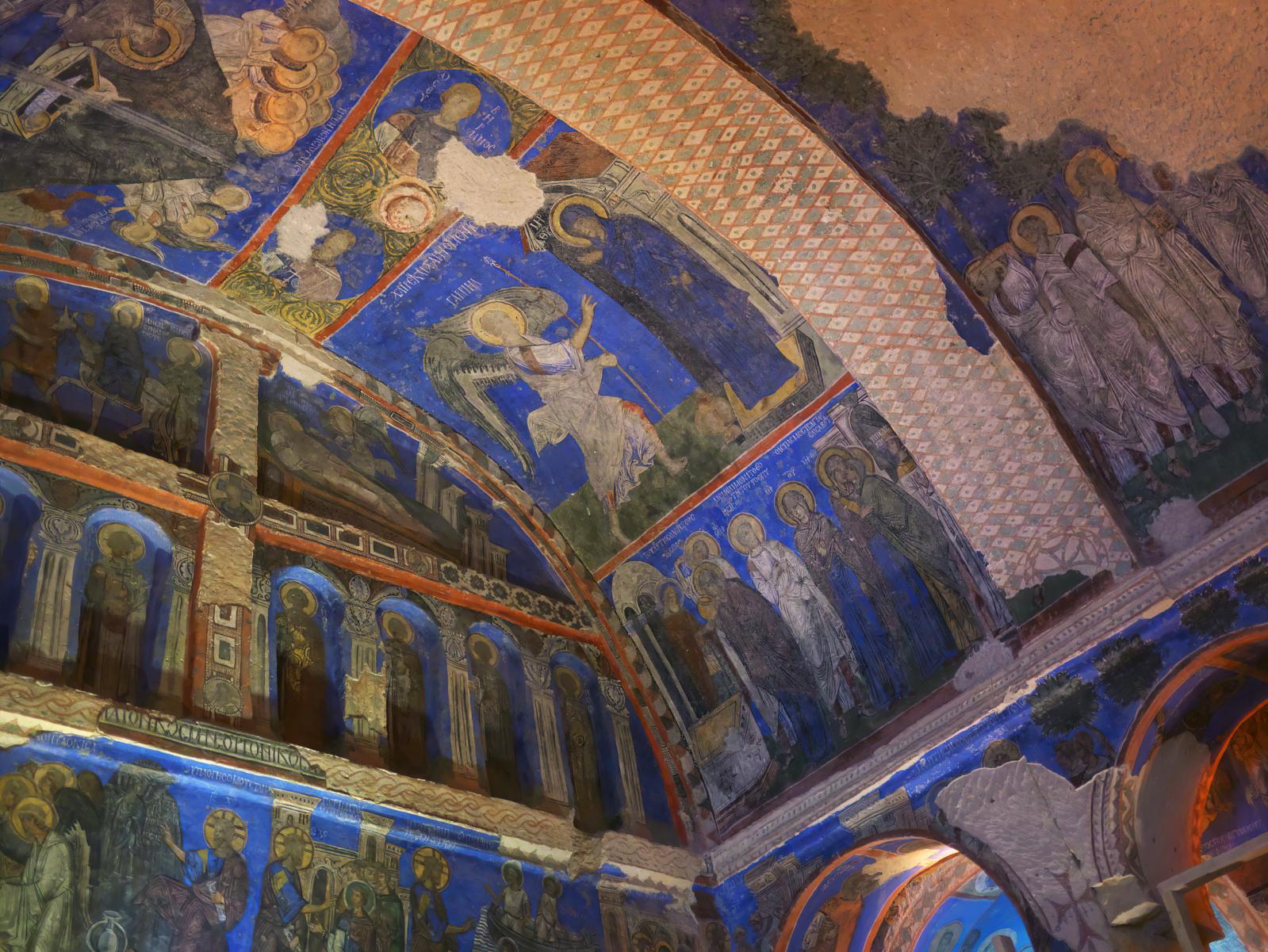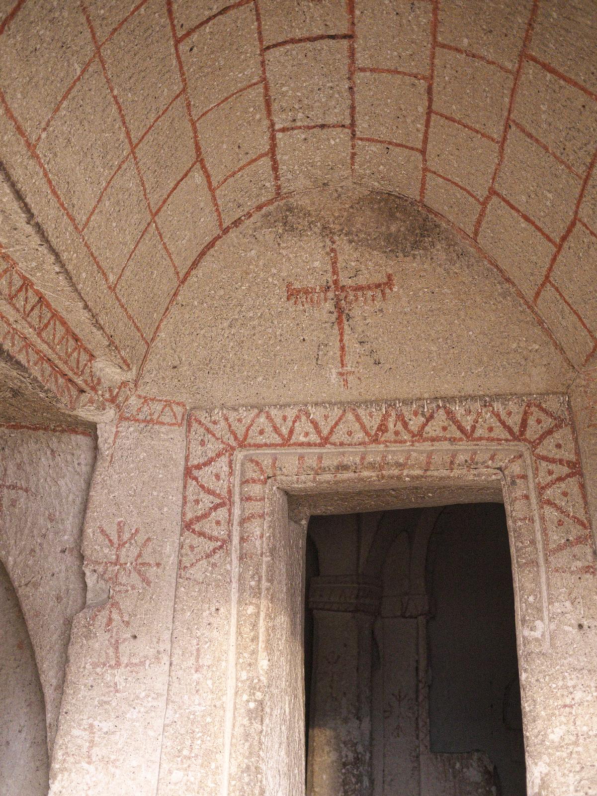 Artwork we saw that evening was simple, red ochre faux-brickwork and religious symbols from the iconoclast period, around 800 AD. At that time church authorities forbade religious images as sacrilege. Later on, frescoes and mosaics predominated and were rationalized as a necessary way to tell Bible stories to illiterate people.