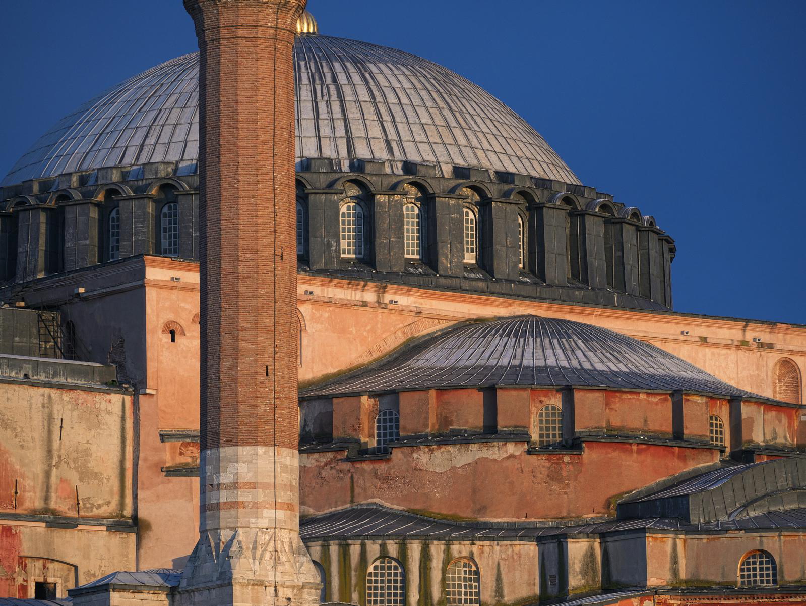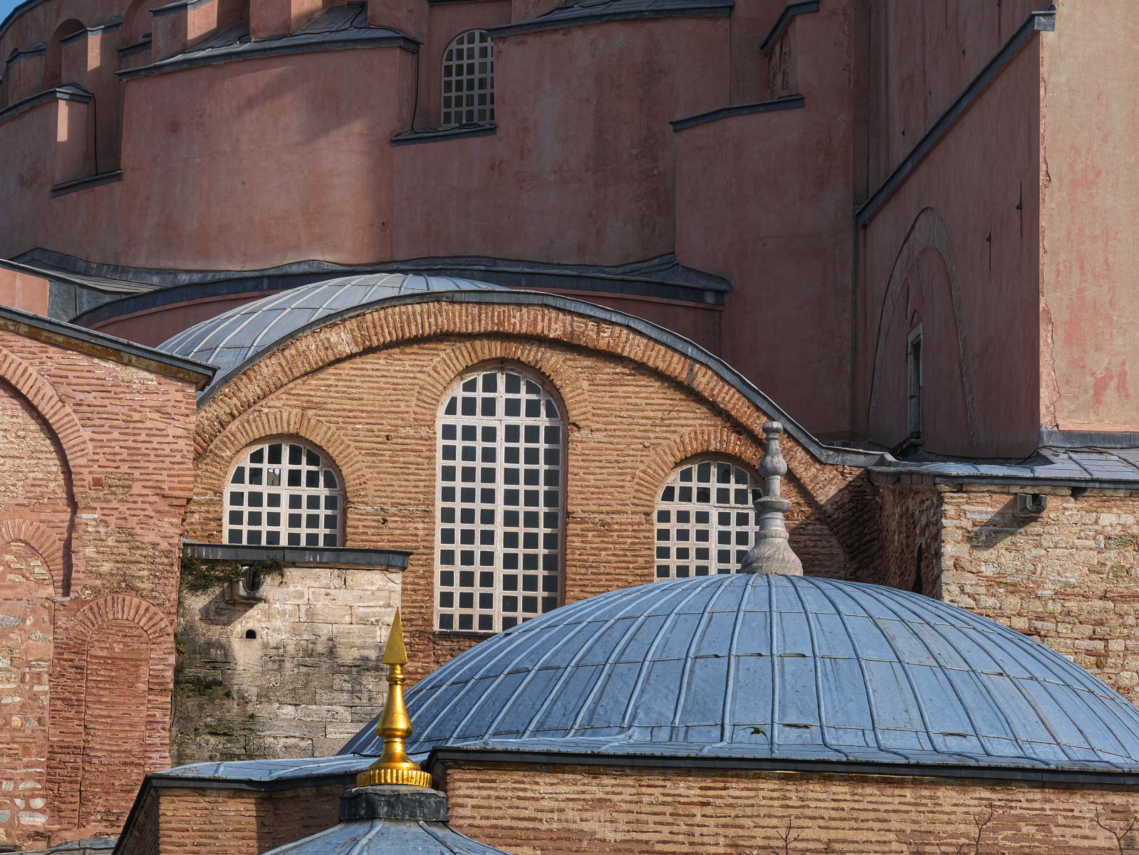 The current structure is the third Hagia Sophia on the site. Constantine’s basilica was destroyed by fire following religious riots in 404 and the second iteration was destroyed in 532 during the Nika Riot, the consequence of a hotly contested chariot race that became a rebellion. Much of Constantinople went up in flames and more than 30,000 rioters were herded into the Hippodrome and slaughtered by Emperor Justinian’s troops. Reconstruction started immediately and the current Hagia Sophia took six years to complete. Originally clad in white marble, it was visible for miles from the Sea of Marmara.