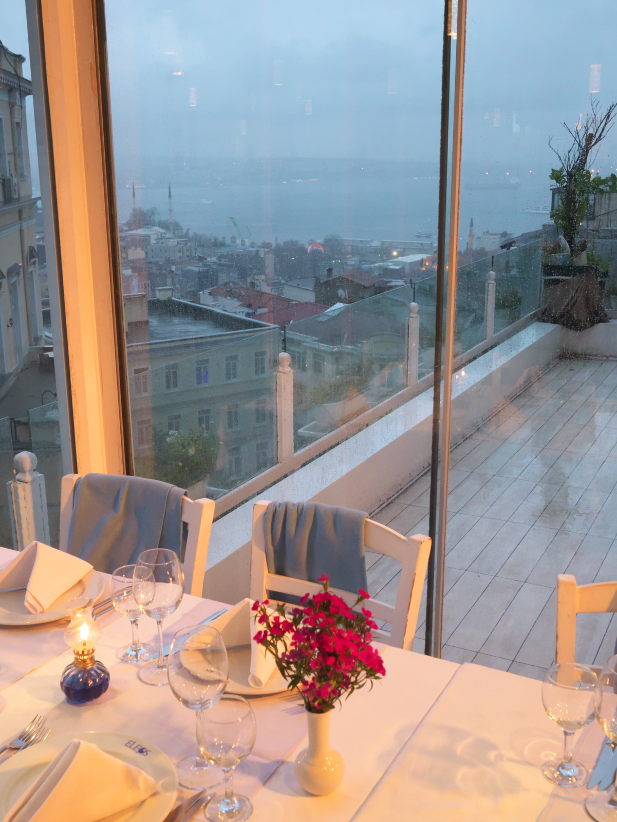 Dinner was at the Eleos fish restaurant, across the Golden Horn in the Beyoğlu district. The restaurant overlooks the Bosporus from a very modern glass box grafted onto the upper floors of an old building.